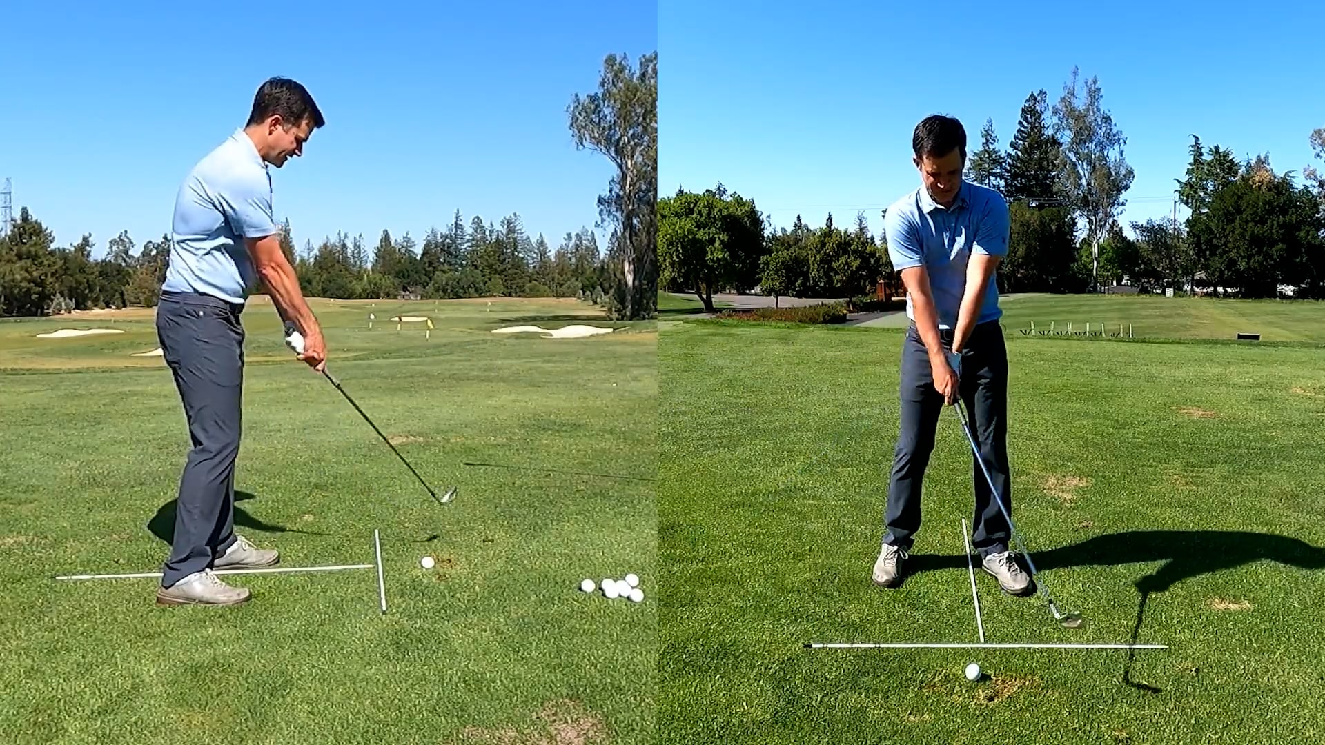 The pieces in transition are a lateral bump of the hips to the left foot, while the left shoulder dips down slightly. I repeat, the left shoulder dips down. The greatest amount of side flexion for virtually all tour professionals I have ever seen on 3D happens just after the top of the swing, and the players do not move into the right side bend until the hands are at delivery position. It is usually the left shoulder dipping down that feels weird if you have struggled with fat shots. You will feel “WAY TOO CLOSE” to the golf ball. This moving of the lower body will create space for your arms to move the club into a NARROW position. In order to do this, bend the right arm, extend your right wrist, and flex your left wrist. Here’s the last piece, while practicing this movement of your arms, allow your forearms to rotate and flatten slightly.