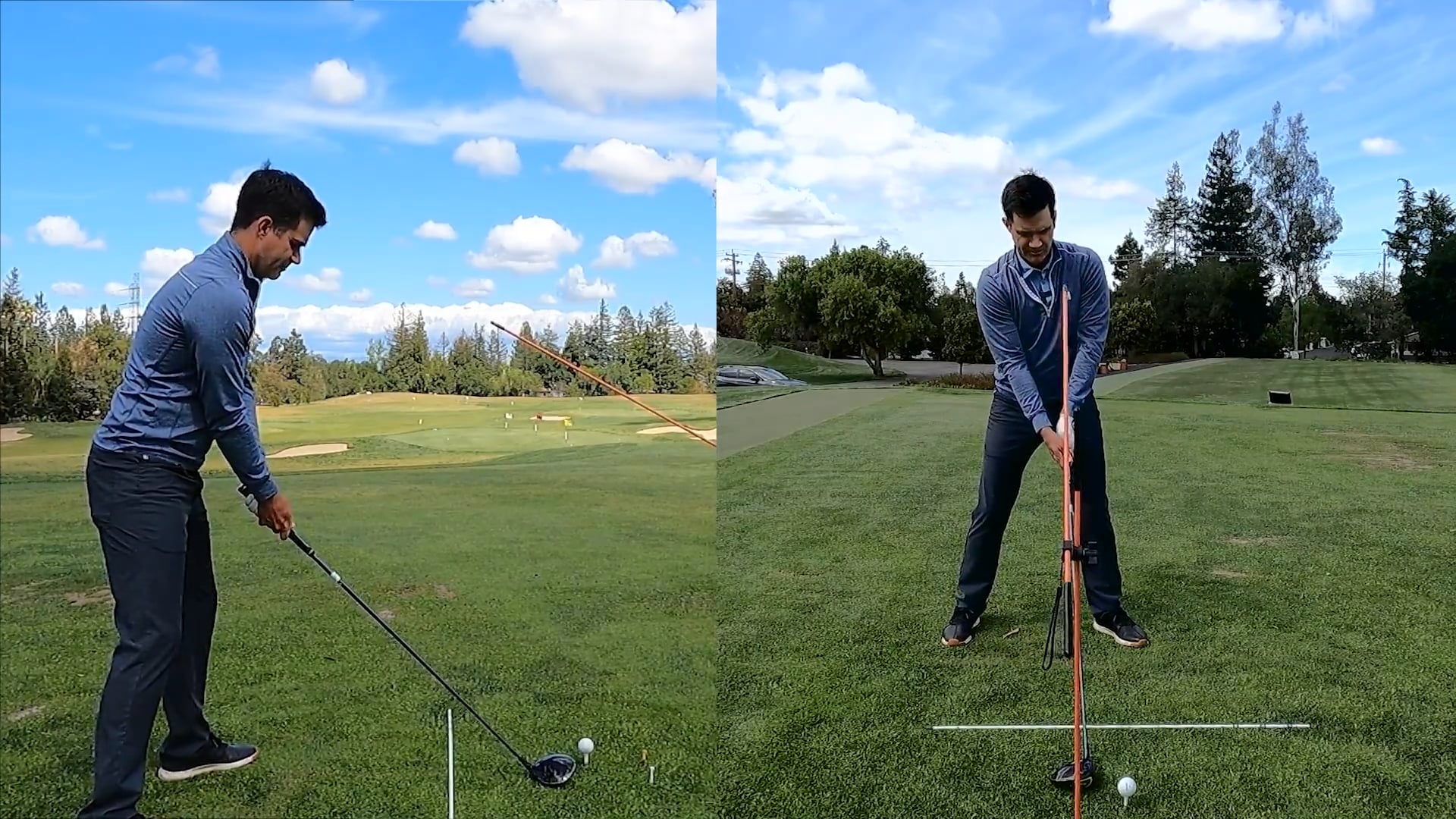 With the driver, you'll want to position the pool noodle about 4 inches behind the ball. This is a good reference for the location you'll want your upper body when you're making contact. One other key is that instead of staying up against the wall (created by the noodle), you'll want to move away from the wall during the release.