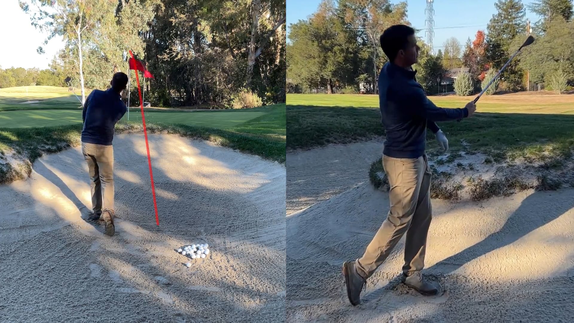 The single-arm releases are one of the best ways to clean up poor arm motion through the ball for any golf shot. The bunker is no exception. With the bunker, the actions are going to be slightly different than the full swing. The trail arm is going to have more of a through/scoop pattern. The lead arm will have more of a throw as well. The lead arm most stay closer to the body than it might in a normal wedge shot to account for the club head passing the handle at impact.