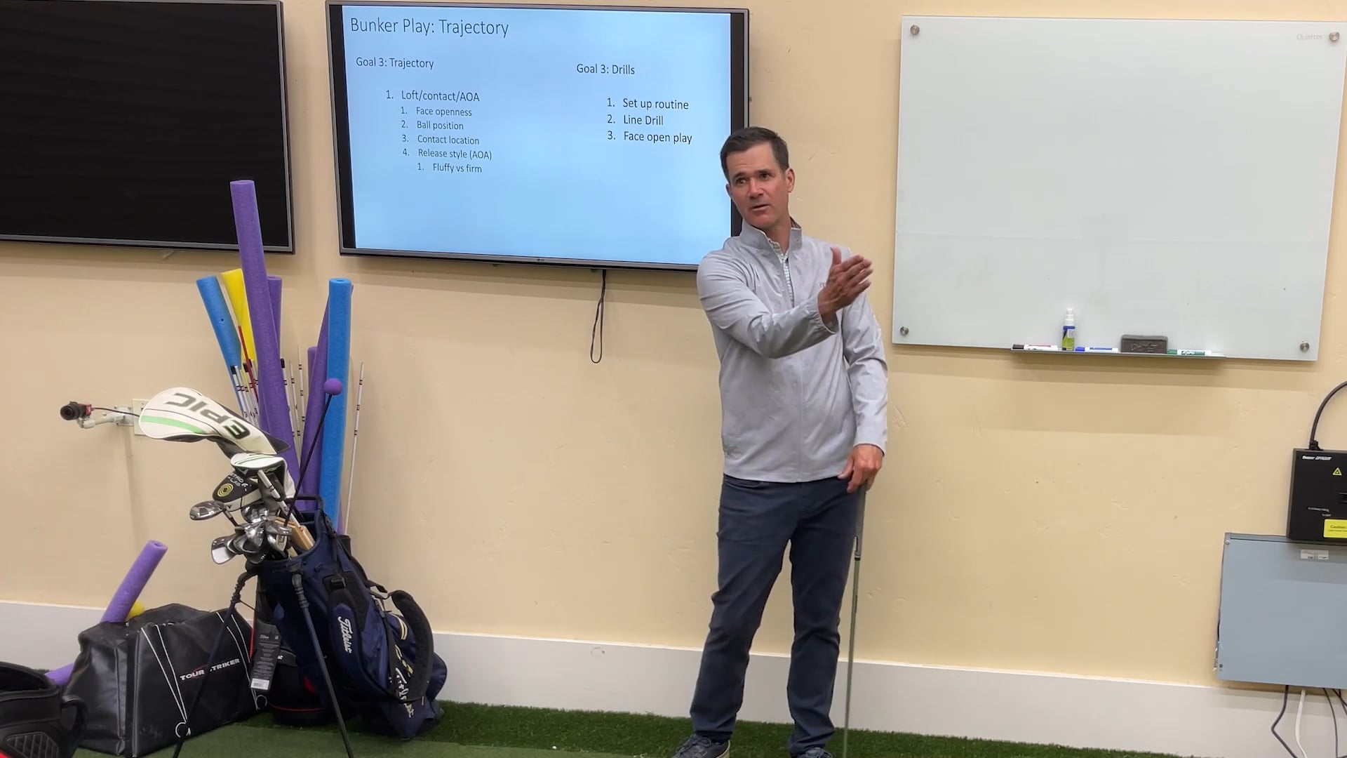 Understanding how to control trajectory can help with multiple shots around the green. But typically, the shot that most students need to learn is how to launch the ball higher to help the ball clear high lipped greenside bunker or to get the ball to stop quickly on downslopes. But controlling trajectory can also help with longer shots where you want the ball to come out a little flatter, and travel further, without having to add a lot of extra force.