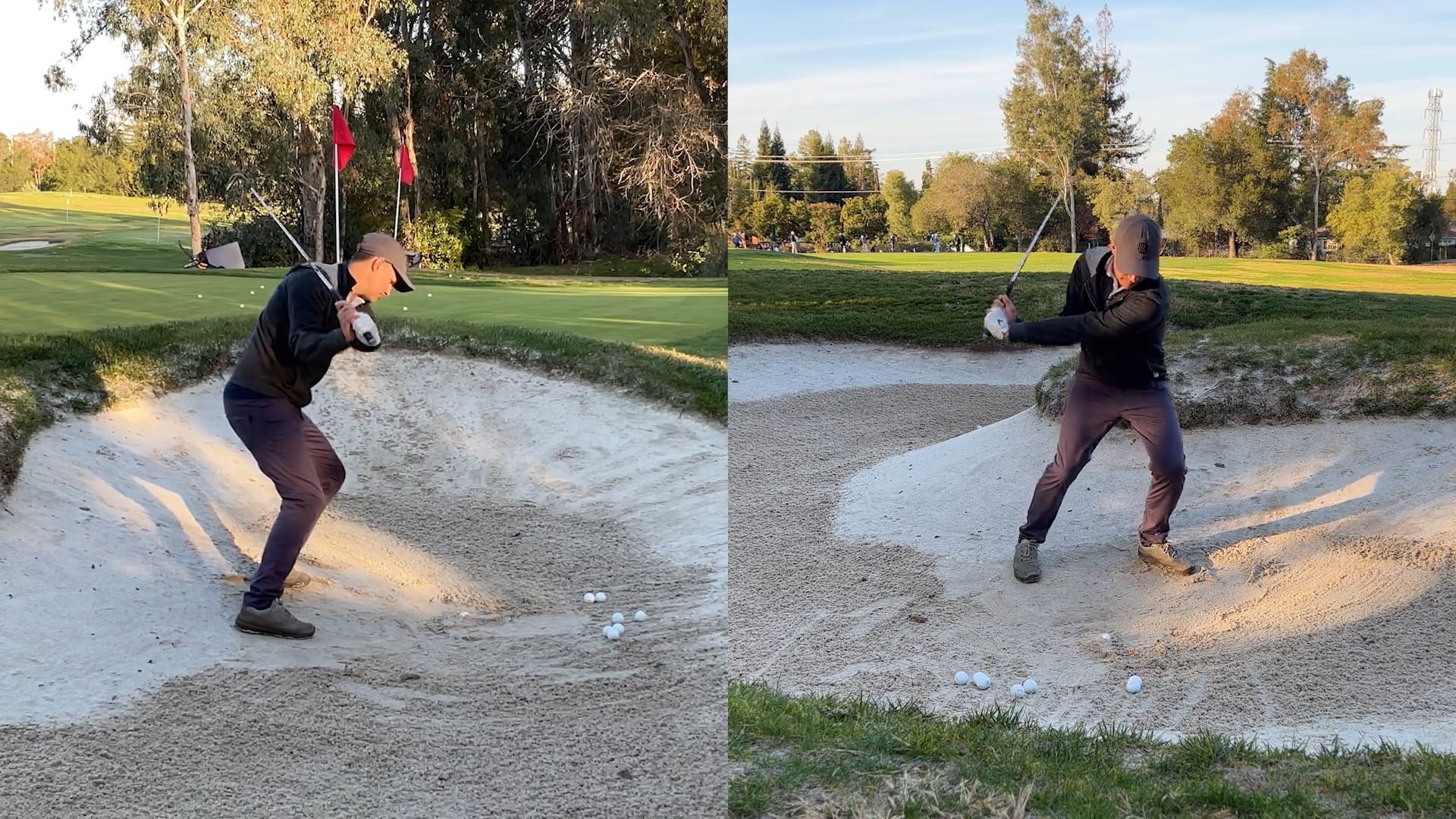 When the ball is buried in the sand you'll have to create a swing with a deeper bottom than normal. There are two ways to adjust your swing in this way. The easiest way is to simply close the face and take away the bounce. Then the club will dig into the sand and get underneath the ball. The other option is to chop down steeply with the heel hitting into the sand first. The heel tends to dig and this will make it much easier to get a deeper divot.