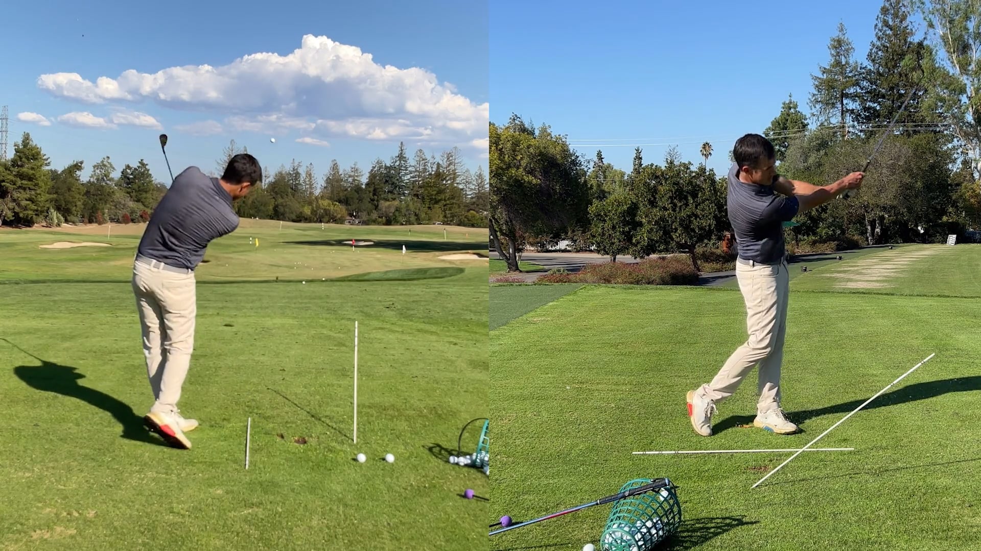 As a general rule, you want to launch your distance wedges at about half the loft. I like to use an alignment stick to help create the visual of the trajectory. You can set up the alignment stick either by approximating half the loft by stepping on the club and getting the clubface parallel to the ground. Or you can use a 7-iron (approximately 30 degrees) or 6-iron (approximately 26 degrees) to help approximately that angle the ball should launch at.